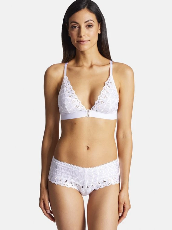 So präsentiert sich AUBADE mit der modernen „Bahia & Moi“ Kollektion. Der Saint-Tropez-Slip aus dieser Serie verzaubert mit einer schönen Kombination aus englischer Stickerei und verführerischen Schnürelementen. Das Clean-Cut-Gewebe aus weichem Baumwollmix schmiegt sich angenehm an die Haut, wodurch die knapp geschnittene Brazil-Panty höchsten Tragekomfort bietet.