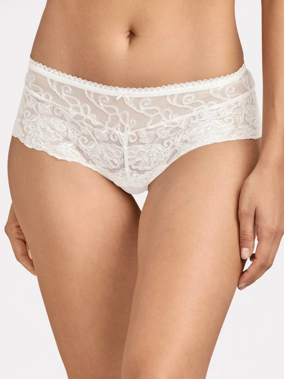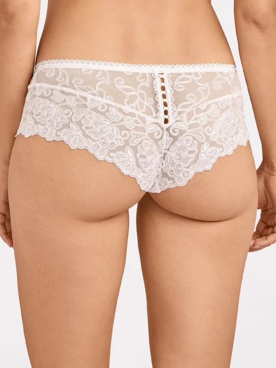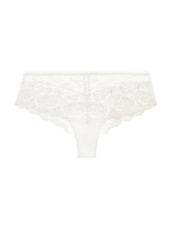 Der Saint-Tropez-Slip der Hochzeitsserie „Pour Toujours“ von AUBADE setzt mit floraler Cornerly-Stickerei und filigranen Details romantische Akzente. Die Panty überzeugt mit einer modischen, bequemen Form und einem knappen Schnitt am Gesäß, der für einen sexy Look sorgt. Das Höschen besteht aus transparenter, verzierter Loch-Stickerei, die sich angenehm an die Haut schmiegt. Die durchbrochene Guipure-Borte auf der Rückseite, die an die Knöpfe eines Brautkleides erinnert, macht die String-Panty zum absoluten Hingucker.