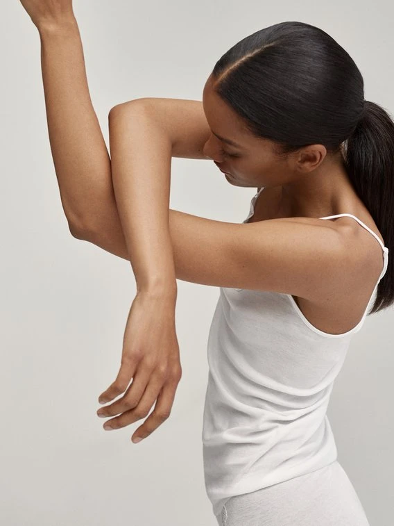 Saumfreies Spaghetti-Top aus extrafeiner Baumwolle. Das Dekolleté ist mit kostbarer Guipure-Spitze veredelt. Die Oberteile der Serie FEMININ SENSE werden auf speziellen Rundstrickmaschinen gestrickt, dadurch gibt es keine störenden Seitennähte. Extraflache, saumlose Abschlüsse unterstreichen das angenehme Tragegefühl – Tag für Tag!