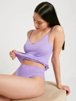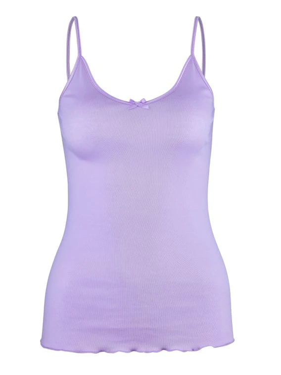 Edles, gerade geschnittenes Spaghetti-Top aus seidiger, mercerisierter Baumwolle. Ausschnitt zart mit einem glänzenden Satinbändchen eingefasst. Das schmückende kleine Schleifchen kann ohne Probleme abgetrennt werden.