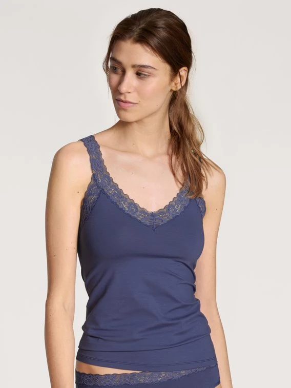 Spaghetti-Top aus der Serie NATURAL COMFORT LACE von CALIDA. Das ärmellose Unterhemd ist ausgezeichnet mit dem swiss+cotton-Gütesiegel. Diese Zertifizierung gilt für Produkte aus allerfeinster, langlebiger und angenehm zu tragender Premium-Baumwolle von höchster Qualität.