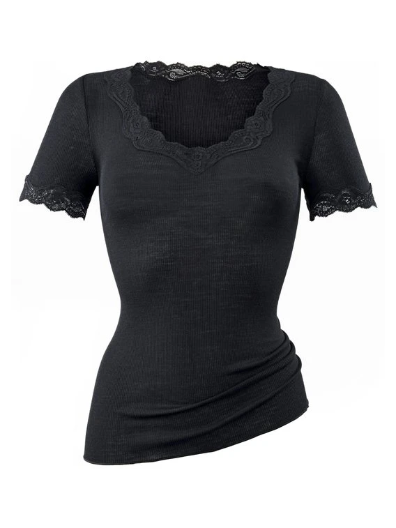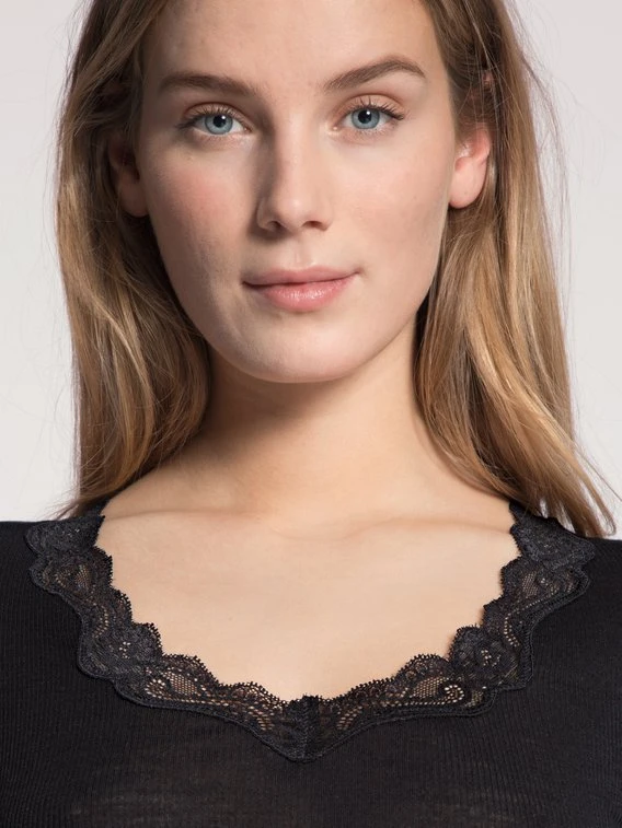 Halbarm-Shirt mit zarter, wertvoll eingearbeiteter Spitze. Die bewährte Calida Schurwolle-Seiden-Unterwäsche ist kuschelig warm und schmeichelt zugleich seidig weich empfindlicher Haut. Das natürliche Fasergemisch ist wunderbar leicht und temperaturausgleichend und somit nicht nur für die kalte Jahreszeit ein ideales Darunter.