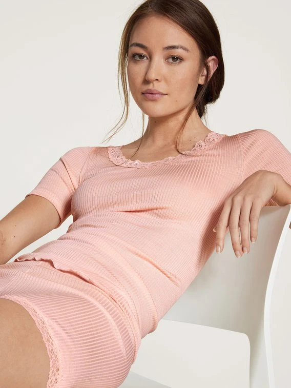 Wer hat gesagt, dass die Form immer der Funktion folgen muss? Das SILKY WOOL JOY Kurzarmshirt von CALIDA begeistert zuallererst mit seiner femininen Ausstrahlung, bevor es mit seinem hochwertigen Merino-Seiden-Mix vollends überzeugt. Diese natürliche Mischung wärmt an kühlen Tagen, reguliert die Körpertemperatur in jeder Saison und fühlt sich wie eine Streicheleinheit an.