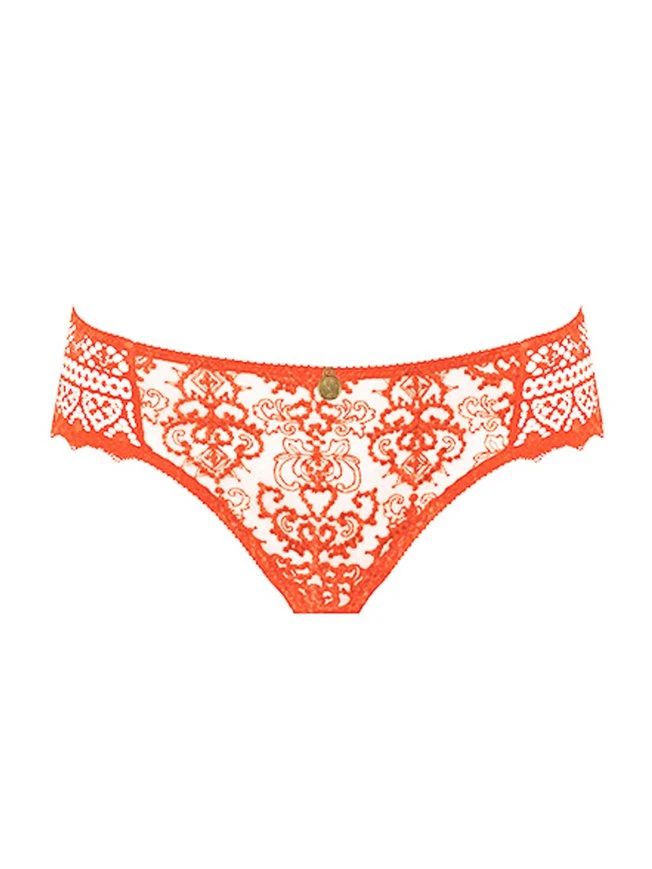 Der hochgeschnittene Slip aus der Top-Serie “Cassiopée” von EMPREINTE vereint zarte Spitze, luxuriöse Stickereien mit semitransparenten Tüll und ist ein idealer Begleiter zu den BHs aus der Serie. Die Spitze an den Seiten sorgt für Transparenz und einen Hauch von Luxus. Ein hochwertiges Schmuckelement ziert den vorderen Bund.
