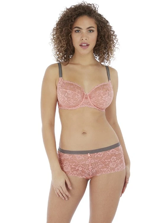 Die Hipster-Short aus der Serie „Off Beat“ von FREYA vereint Femininität und Tragekomfort. Die weiche semitransparente Spitze schmiegt sich angenehm an die Haut und betont die weibliche Figur durch ihren hüftigen Sitz sehr vorteilhaft. Das kontrastfarblich abgesetzte breite Softgummiband setzt ein optisches Highlight im Streifenlook und wird durch eine filigrane Satinschleife ergänzt.