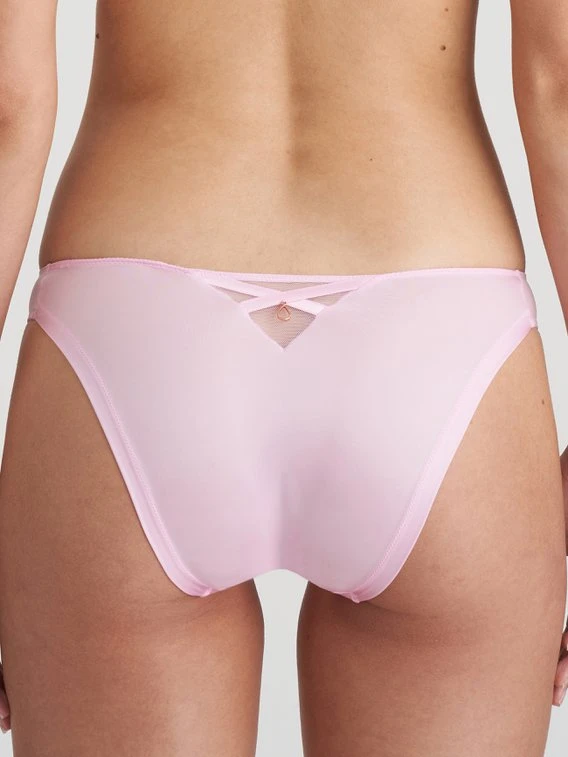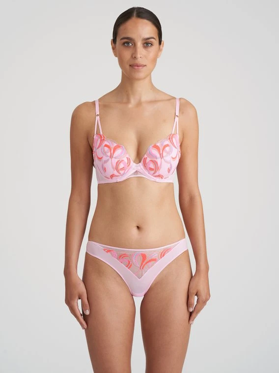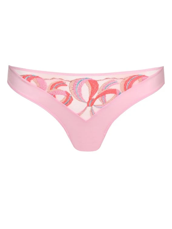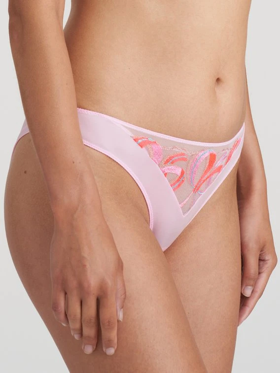 Der Rio-Slip von MARIE JO aus der “Vita” Serie präsentiert sich in einem lieblichen Look mit einzigartigen Details. Die Vorderseite ist mit einem dreieckigem Einsatz aus semitransparenten Material gearbeitet und mit abstrakten Schleifen Stickereien in verschiedenen Rosa- und Rottönen verziert. Der Schambereich und die Rückseite sind komplett blickdicht und das Zwickel ist mit Baumwolle unterlegt.