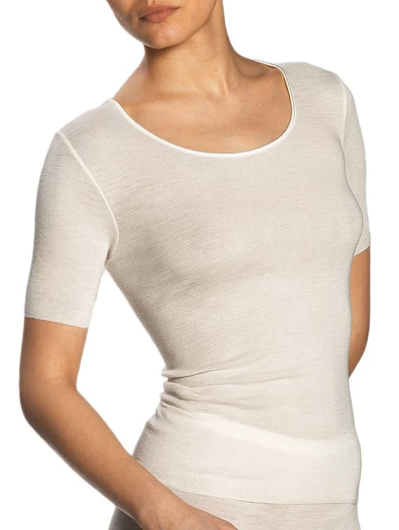 Kuschelig warm und hautschmeichelnd. Die beliebte MEY Schurwolle-Seiden-Unterwäsche ist extrem weich und schmeichelt besonders empfindlicher Haut. Veredelt wird dieses Kurzarm-Top aus rein natürlichen Materialien durch ein dekoratives Satinbändchen entlang des Ausschnitts und am Armabschluss. Saumfreies Kurzarm-Top von MEY.