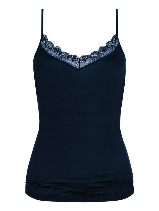 Das Spaghetti-Top der Serie „Luise“ von MEY ist ein hochwertiges Unterhemd, das mit einem schlichten, zeitlosen und elegant-femininen Design begeistert. Weiches, elastisches Modal schmiegt sich angenehm an die Haut und bietet höchsten Tragekomfort. Optischer Blickfang ist der V-Ausschnitt mit zartem Spitzen-Besatz.