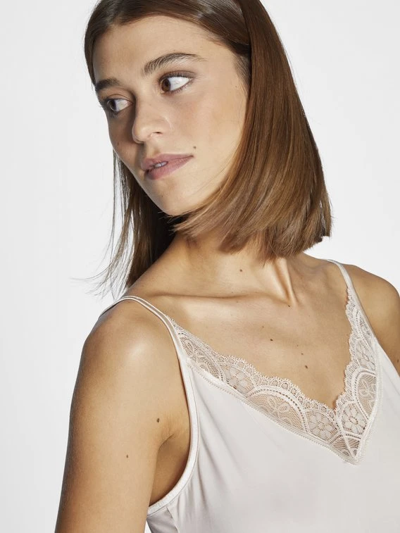 Das Camisole der Serie „Poetry Fame“ von MEY schmiegt sich dank besonders weicher, elastischer Viskose perfekt an die Haut und bietet ein natürliches, luxuriöses Tragegefühl. Das Spaghetti-Top verfügt über längenverstellbare Träger, um eine ideale Passform zu ermöglichen. Die zarte Spitzen-Verzierung an Dekolleté und Saum runden das romantische Design perfekt ab.