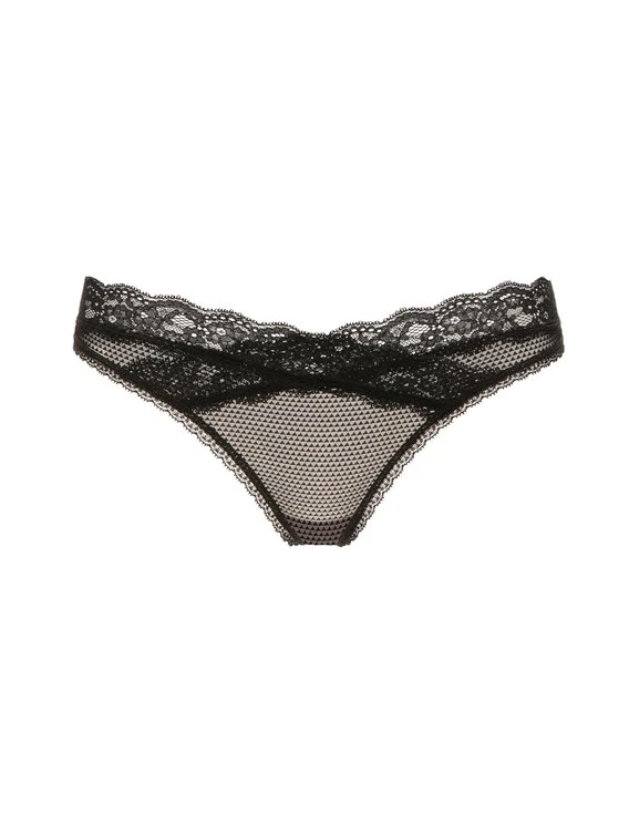 Modern, sexy und verspielt präsentiert sich der String aus der “Brooklyn”-Serie von PASSIONATA. Das Modell ist an der Vorderseite doppelt und blickdicht mit Tüll unterlegt. Die Rückseite spielt hingegen mit leichter Opazität. Der grafische Look wird mit floraler Spitze am Bund spielerisch kontrastiert.