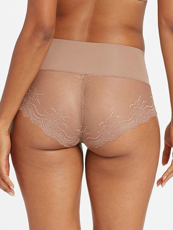 Die Lace-Hi-Hipster Panty aus der “Undie-Tectable” Serie der Hollywood-Marke SPANX besteht aus einer raffinierten Kombination aus weichem, langlebigem Stretchmaterial und feiner, transparenter Spitze. Der hohe Bund der Panty wirkt leicht modellierend und kaschiert ein kleines Bäuchlein, während die weichen Abschlüsse und das flache Design das Höschen unsichtbar unter der Kleidung machen.